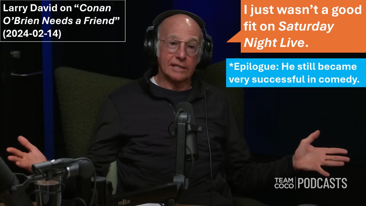 Last year, the comedian Larry David recounted a story on the podcast "Conan O'Brien Needs a Friend", and it is highly relevant to all of us in our career development. He used to work as a writer on "Saturday Night Live" (SNL), a very successful TV show with a long history of producing comedy stars. Unfortunately for Larry, he lasted only one season on SNL.