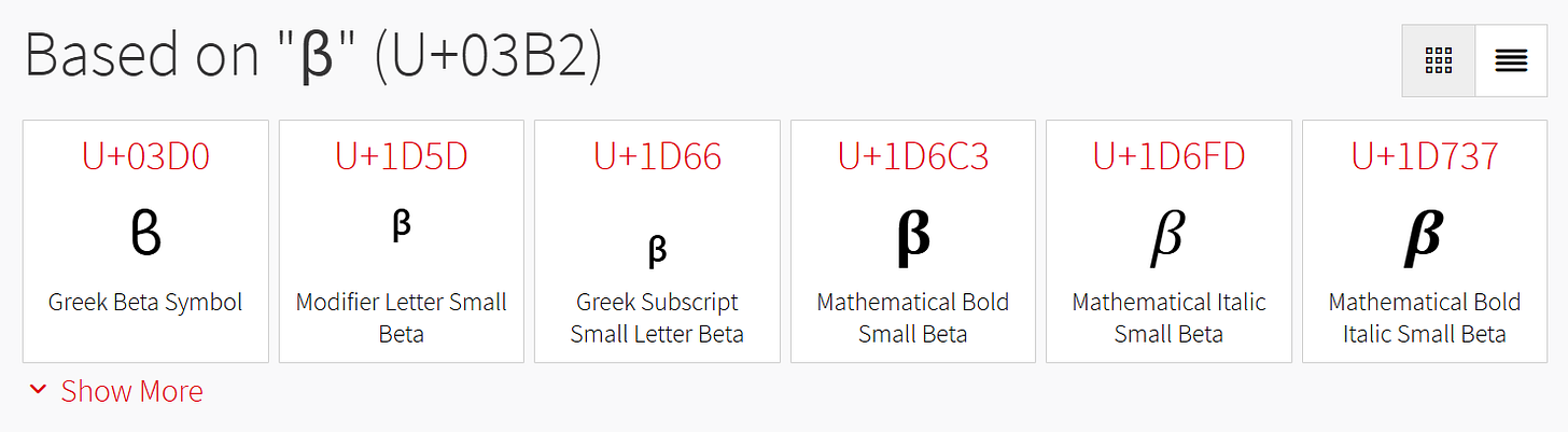 I look for the suitable character, copy it from Compart Unicodeβs website, and paste it into my text editor in Substack1 or LinkedIn. For example, here is the webpage for Ξ².