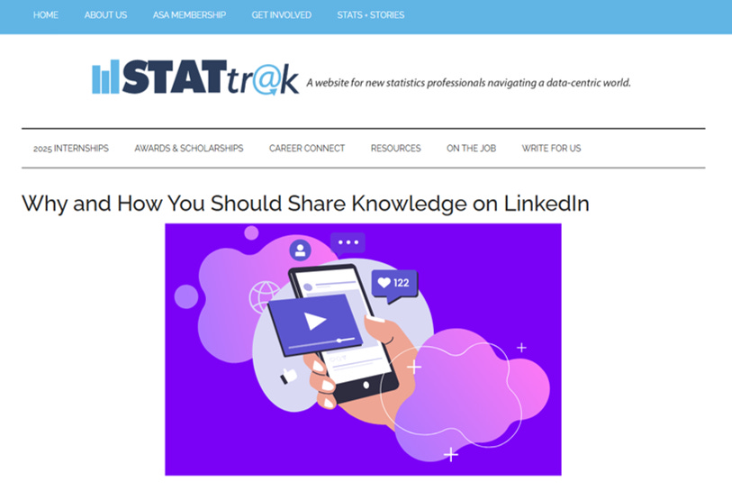The above is an excerpt from my newest article for STATtr@k, a website from the American Statistical Association (ASA). It is entitled “Why and How You Should Share Knowledge on LinkedIn”. I encourage you to read it for much more insight and advice.